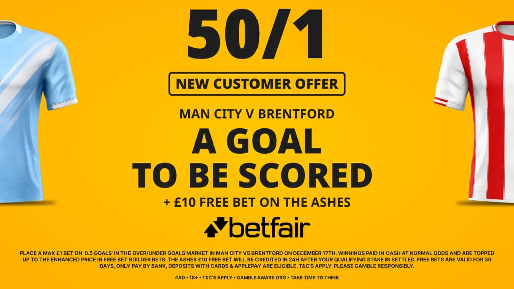 A GOAL TO BE SCORED IN MAN CITY VS. BRENTFORD @ 50/1 + A £10 FREE BET ON THE ASHES