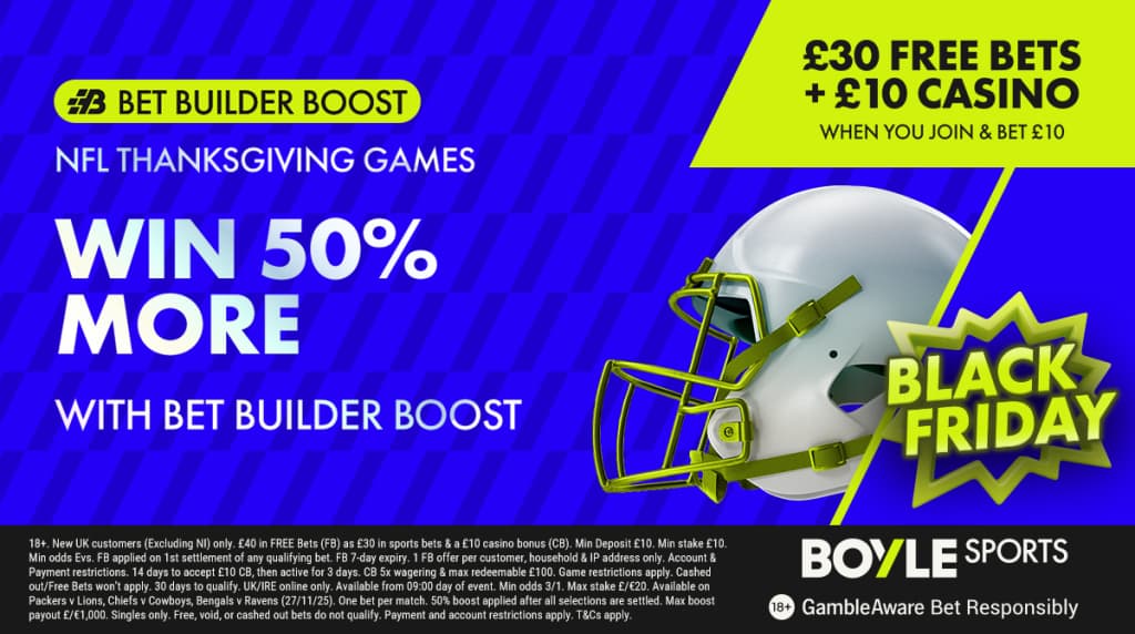 BET £10 & GET £30 IN FREE BETS + A £10 CASINO BONUS + BLACK FRIDAY - WIN 50% MORE WITH BET BUILDER BOOST ON NFL THANKSGIVING GAMES