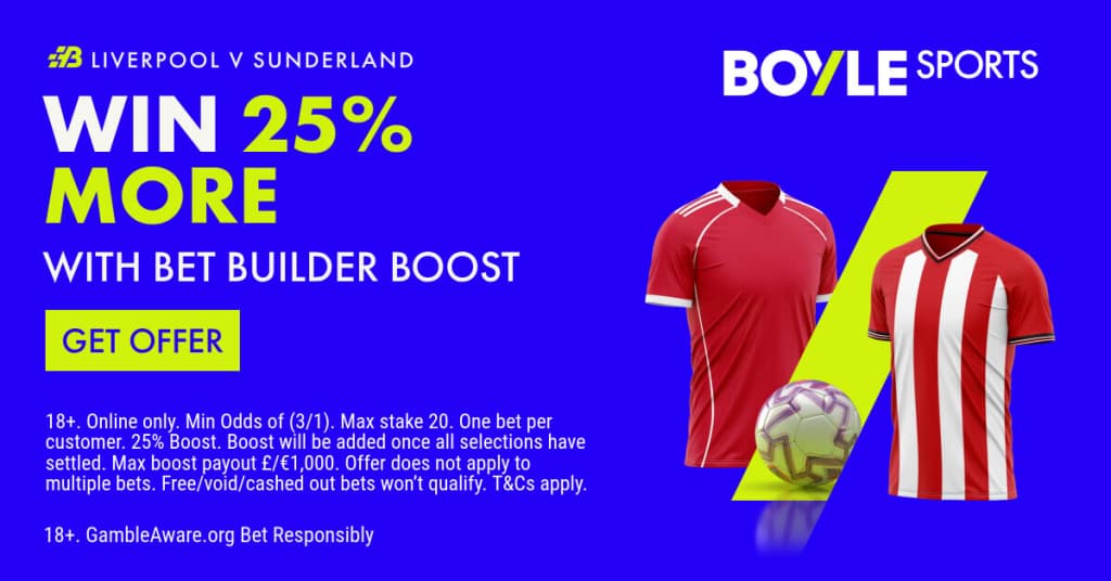BET £10 & GET £30 IN FREE BETS + A £10 CASINO BONUS + 25% BOOST ON YOUR BET BUILDER IN LIVERPOOL VS. SUNDERLAND