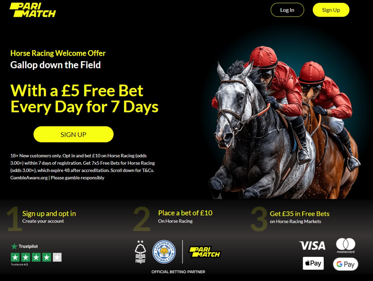 Parimatch's "Bet £10 and get a £5 Free bet every day for 7 days" welcome offer is a fantastic way for new customers to experience the thrill of horse racing betting. Don't miss out on this exciting opportunity to receive daily free bets and potentially win big. Sign up for Parimatch today and let the races begin!